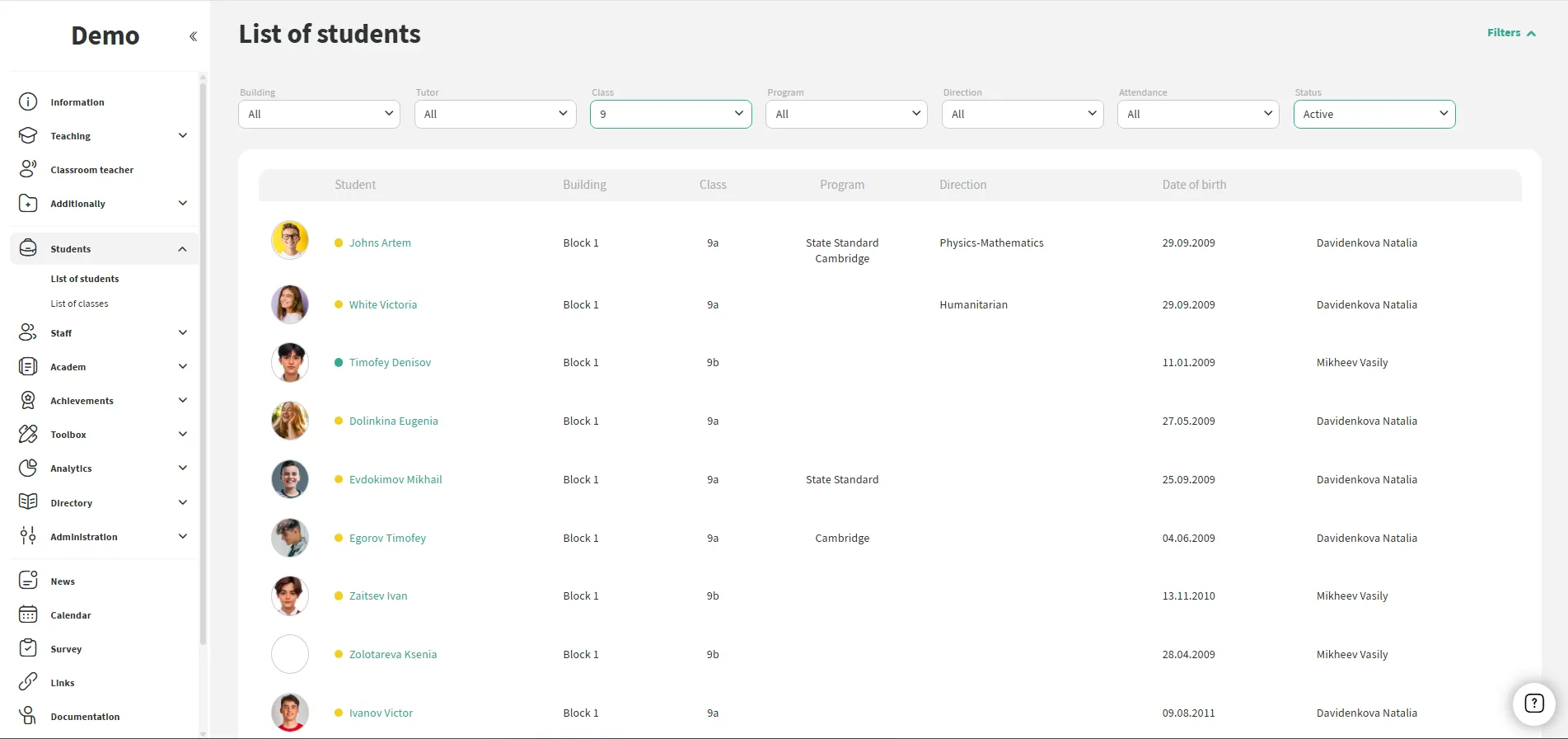 At any time, you can see who is currently at school and who is outside — using filters or tags in the student list.