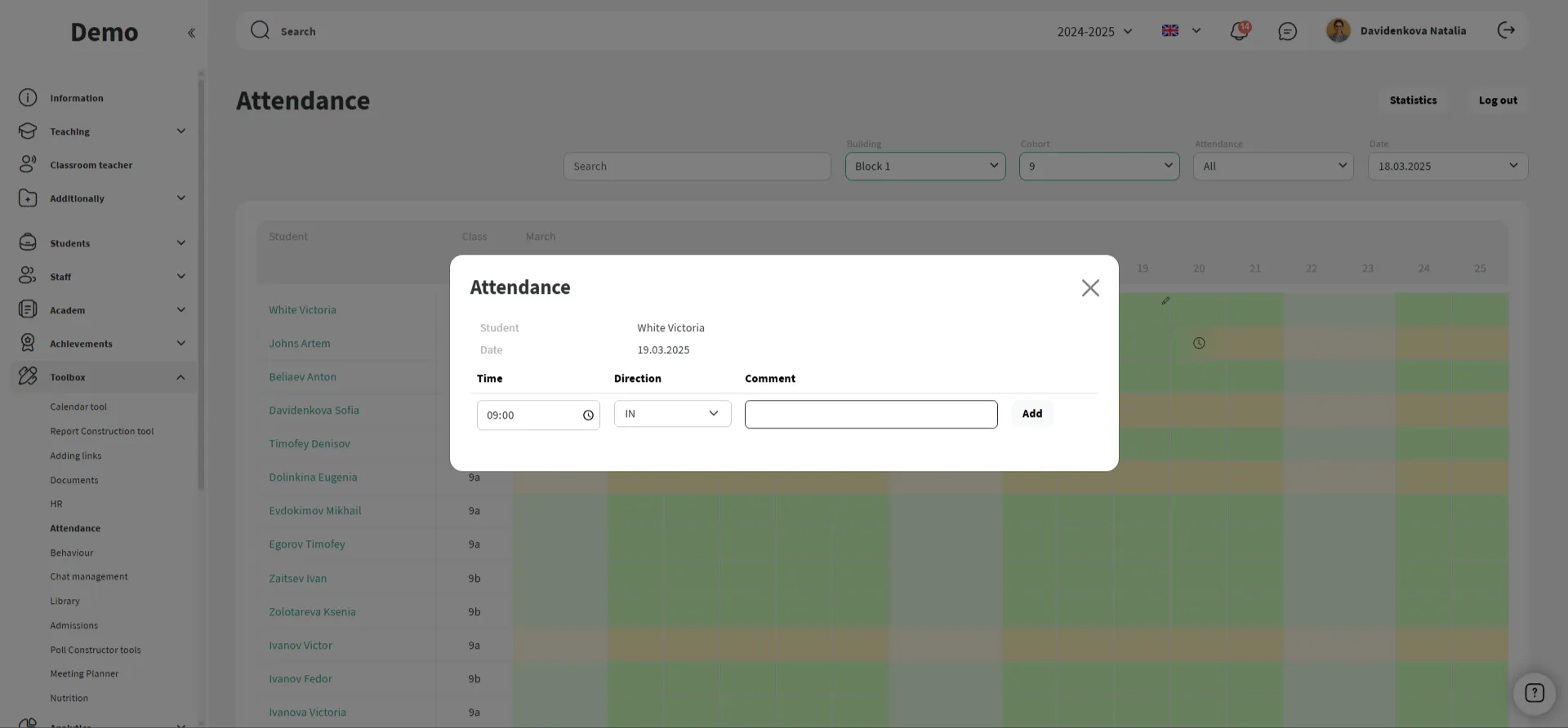 Staff can record a student's arrival and departure with one click. The time is saved automatically, and comments can be added.