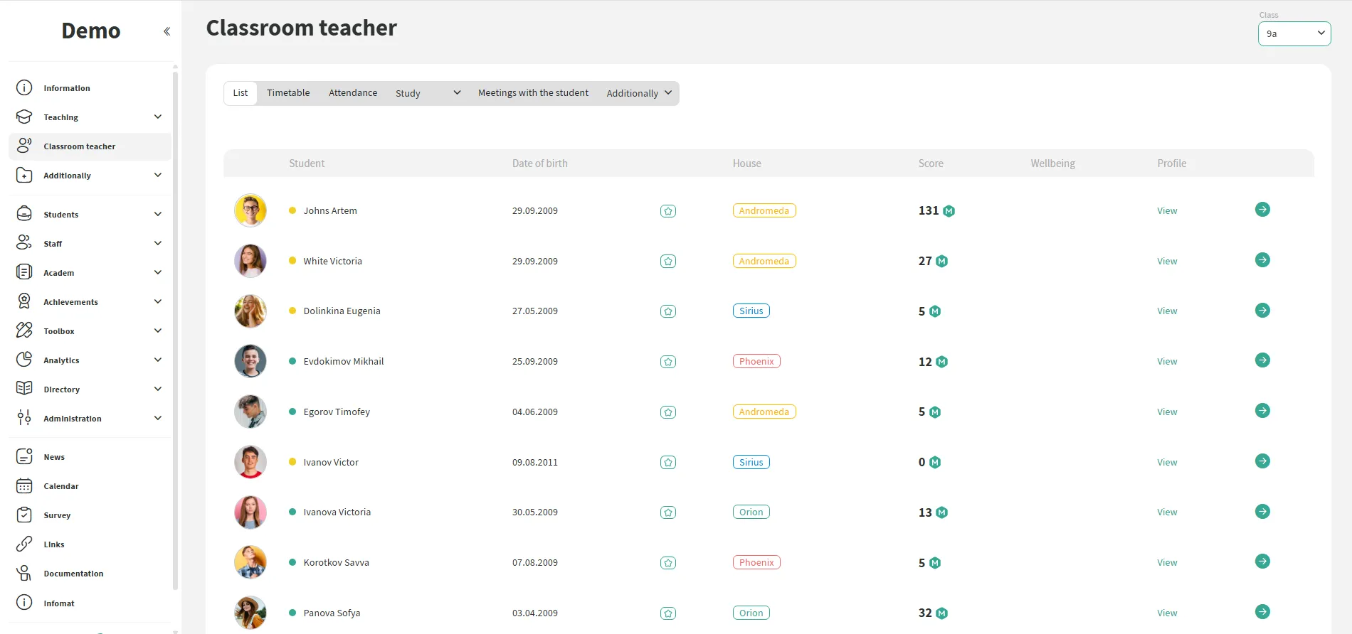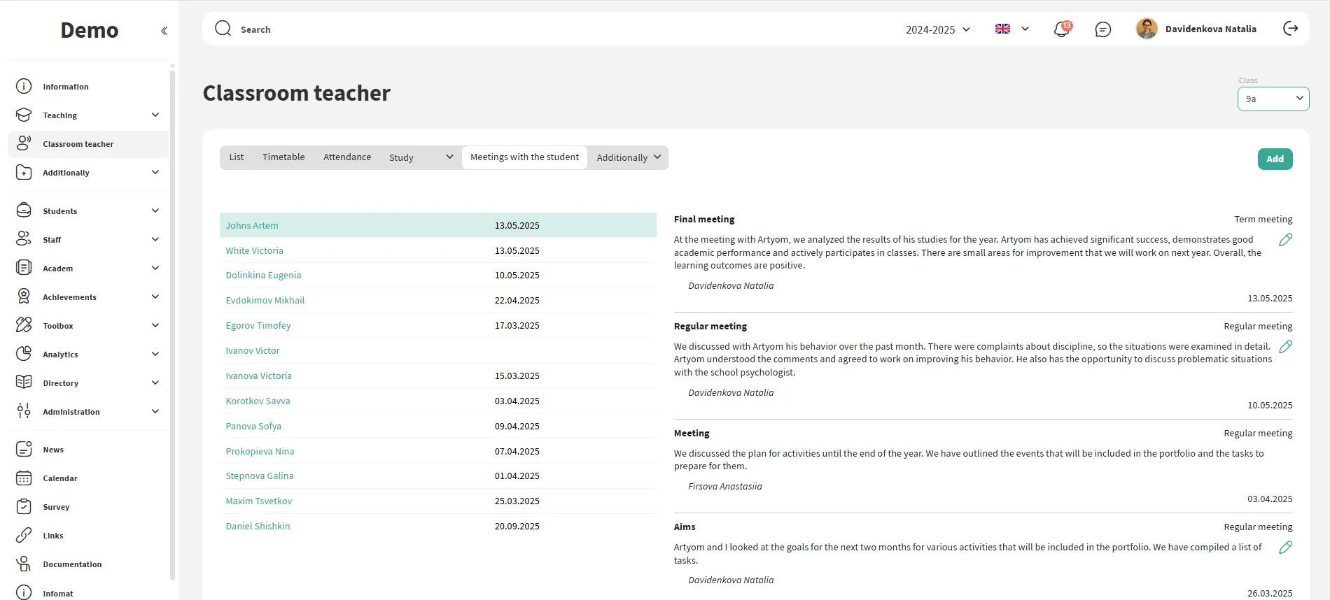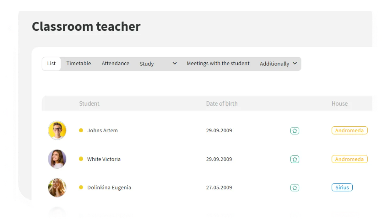 The mentor sees all assigned students and can quickly access their profiles: schedule, grades, activities, parent information — always at hand.