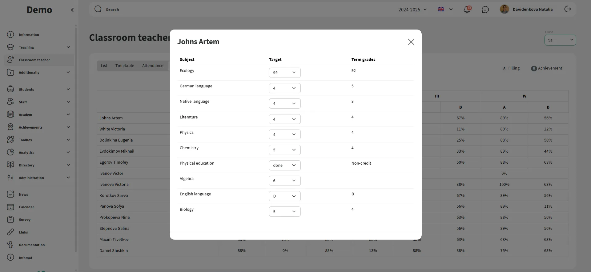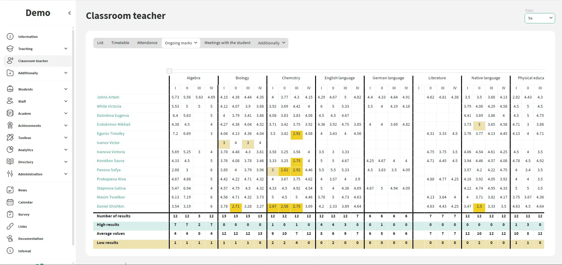 The mentor can view students' grades across all subjects — current, final, trends, and statistics. This helps to identify difficulties early and support progress effectively.