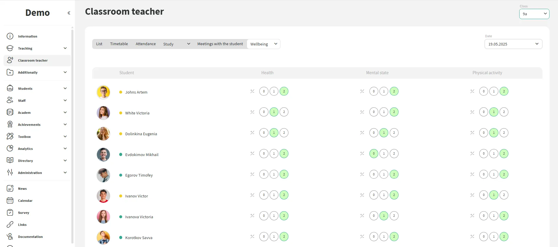 A brief daily assessment of the student's condition. The system helps to notice changes in mood and overall well-being.