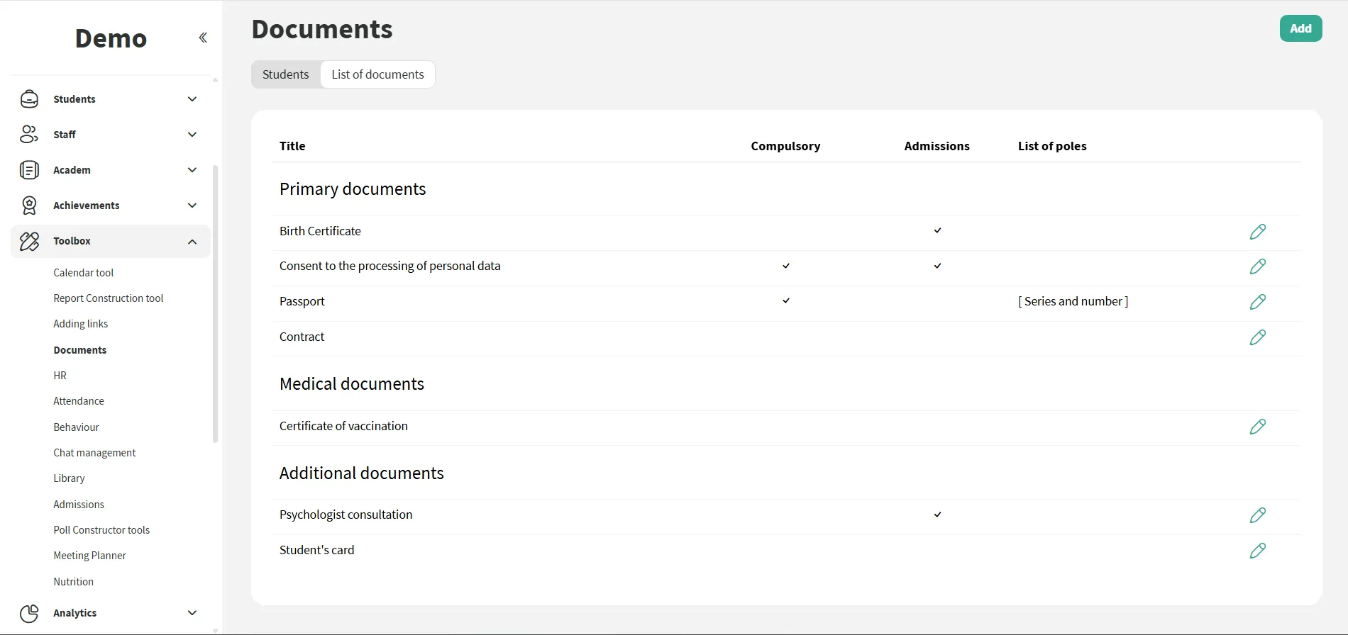 You specify which documents are needed for admission, education, and medical records. For each document, a file can be uploaded and additional fields with related information can be added.
