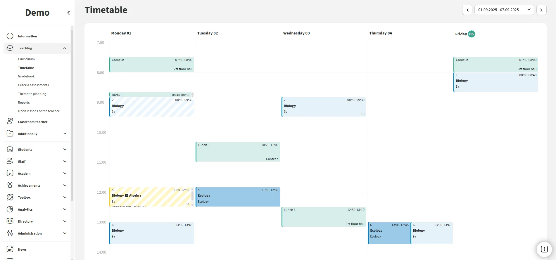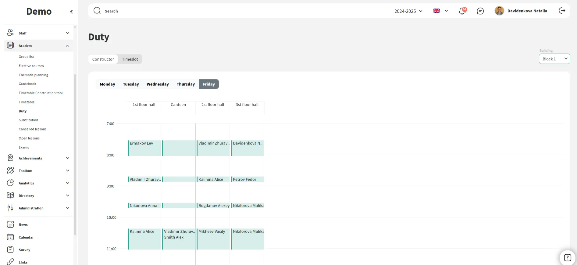 The system allows setting precise duty intervals linked to buildings and days of the week.