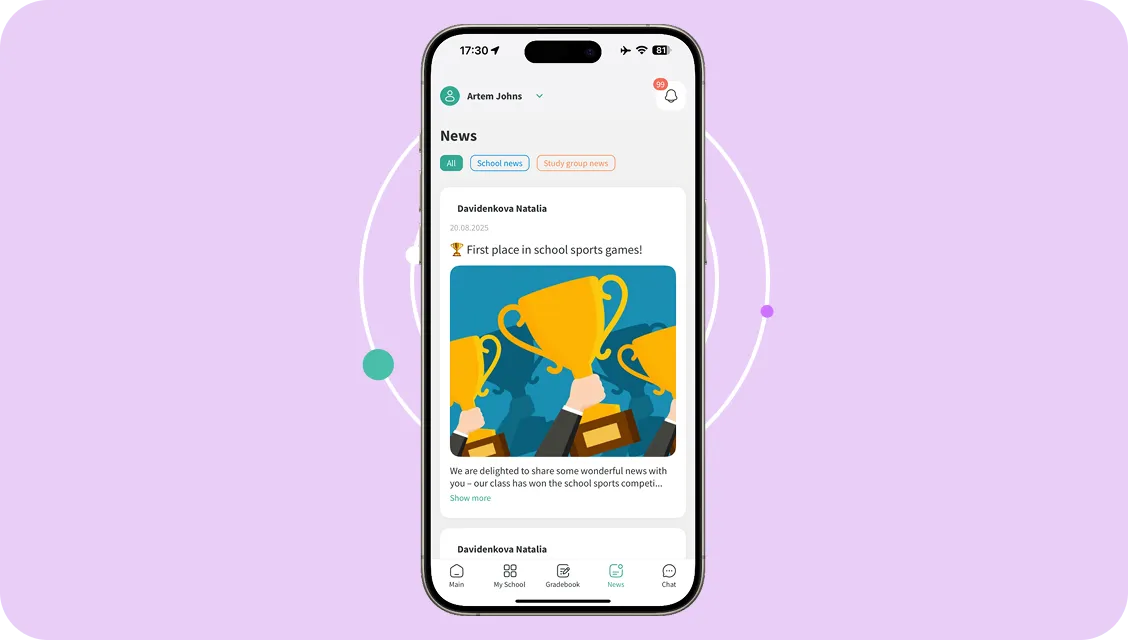 News is displayed not only in the web version but also in the mobile app. Parents, students, and teachers always stay up to date.