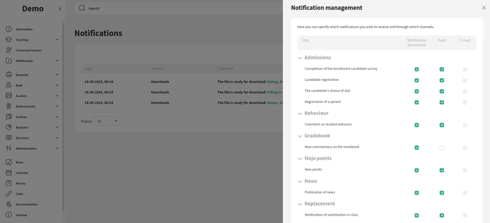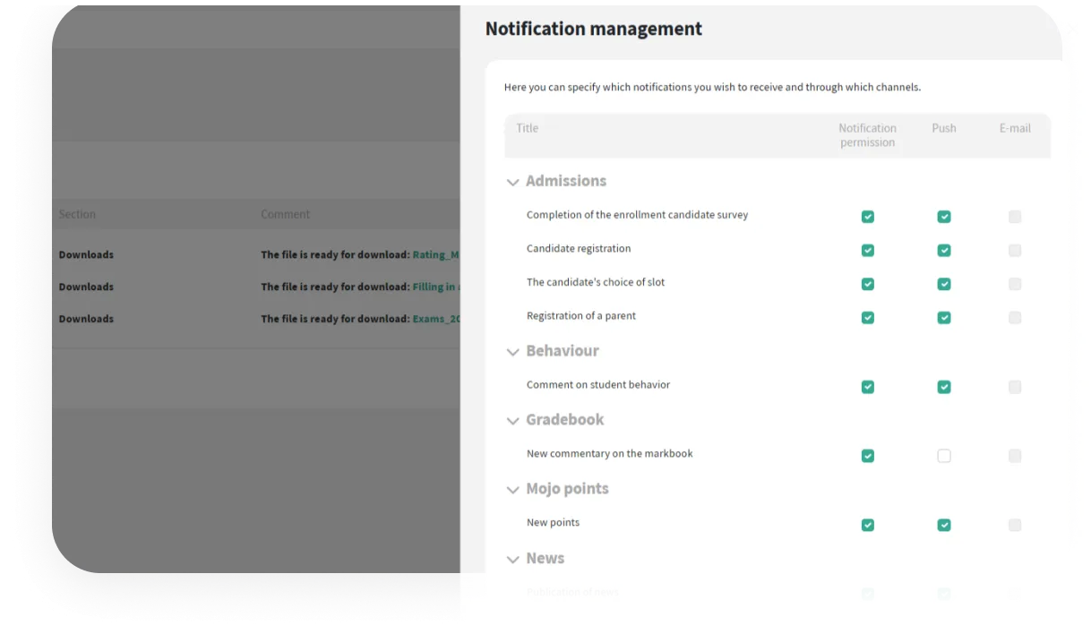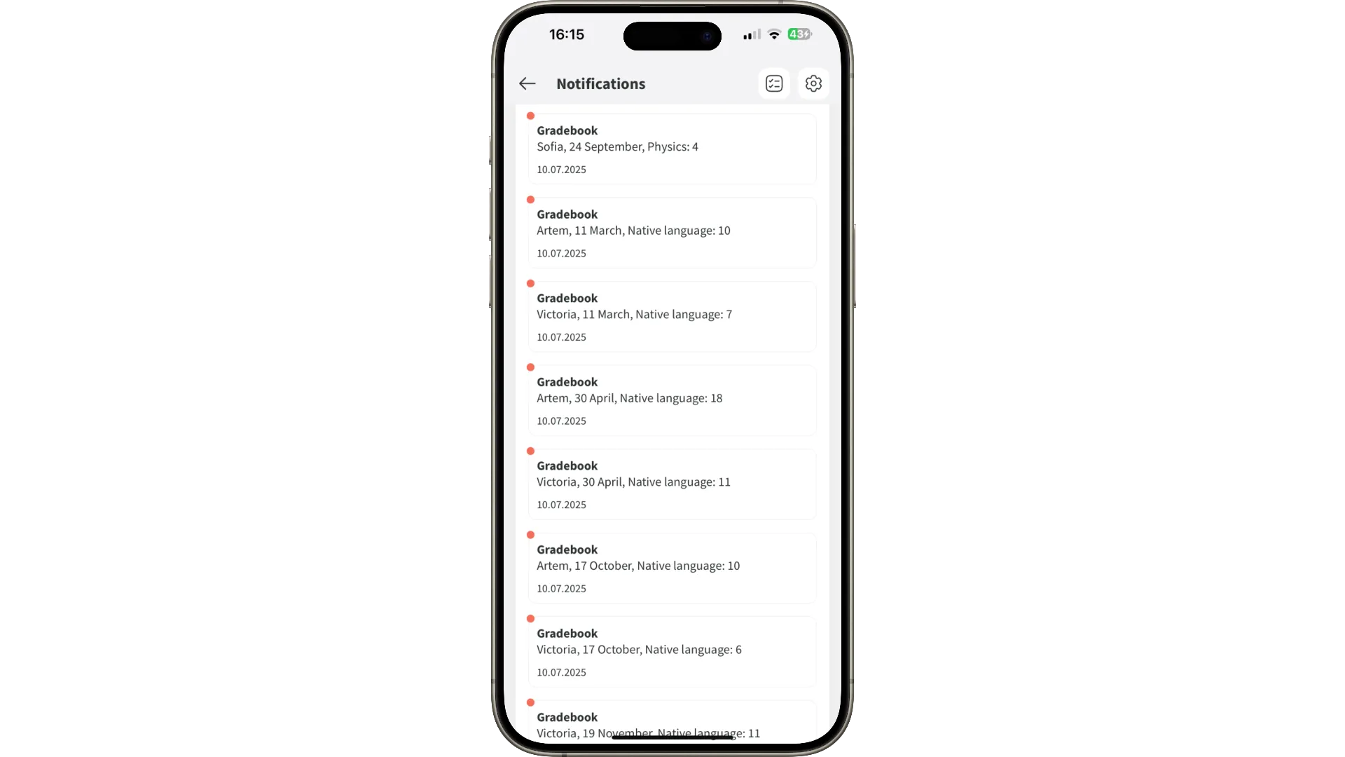 New grades, homework, behavior, reports, substitutions, publications, and enrollment status — all delivered promptly.