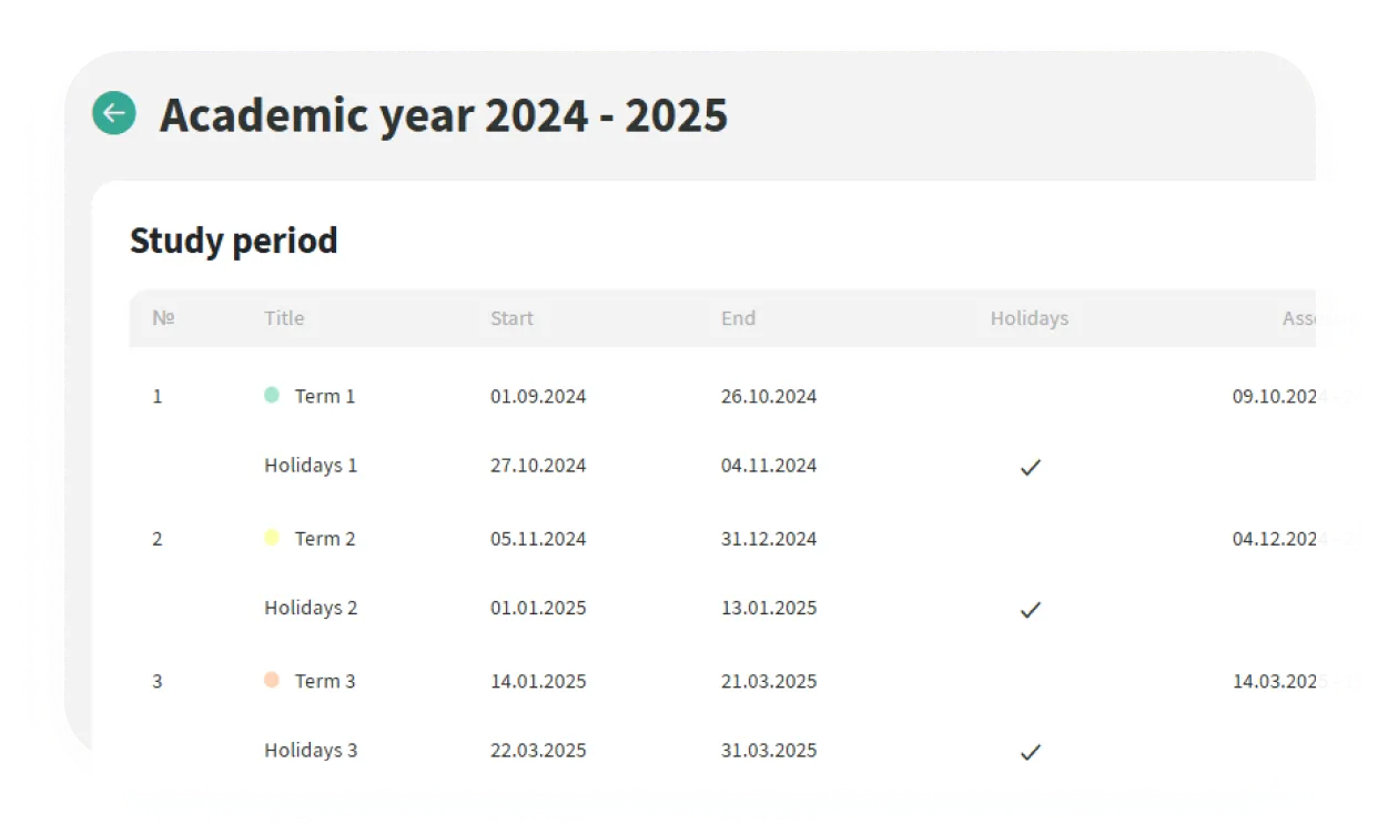 Design the year's structure considering quarters, semesters, holidays, and breaks. This serves as the foundation for all school processes.