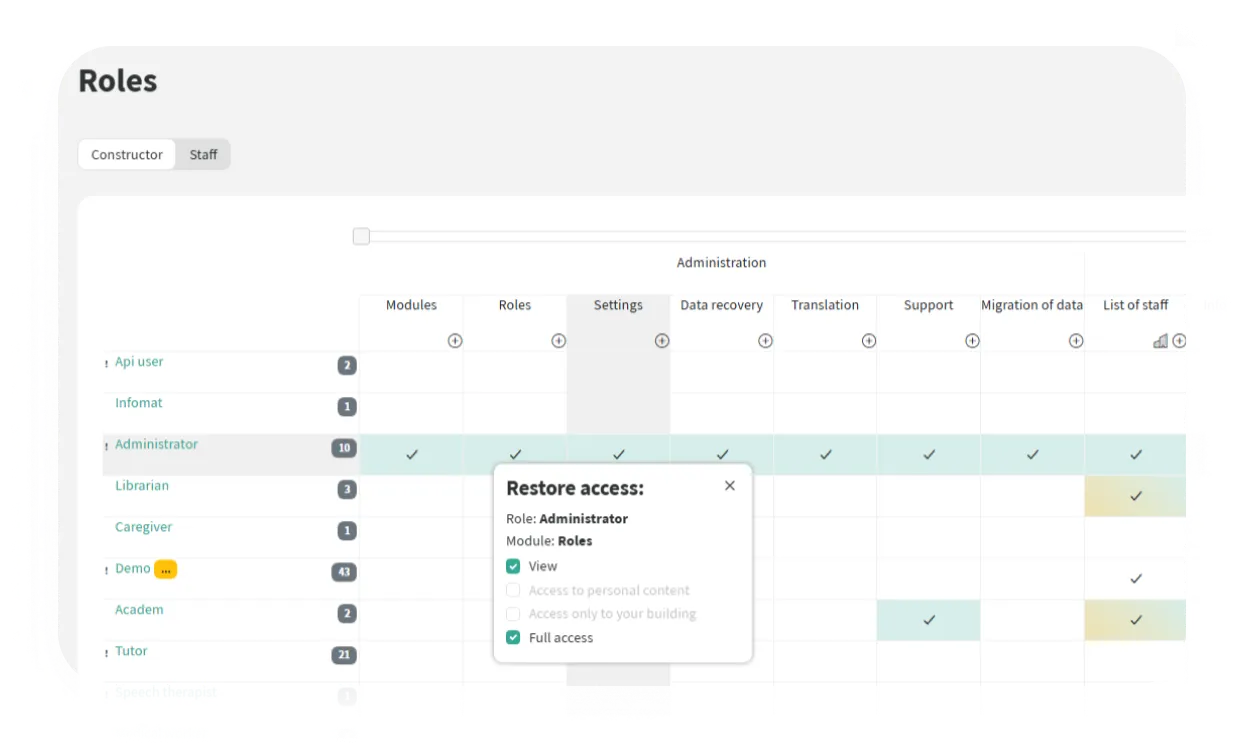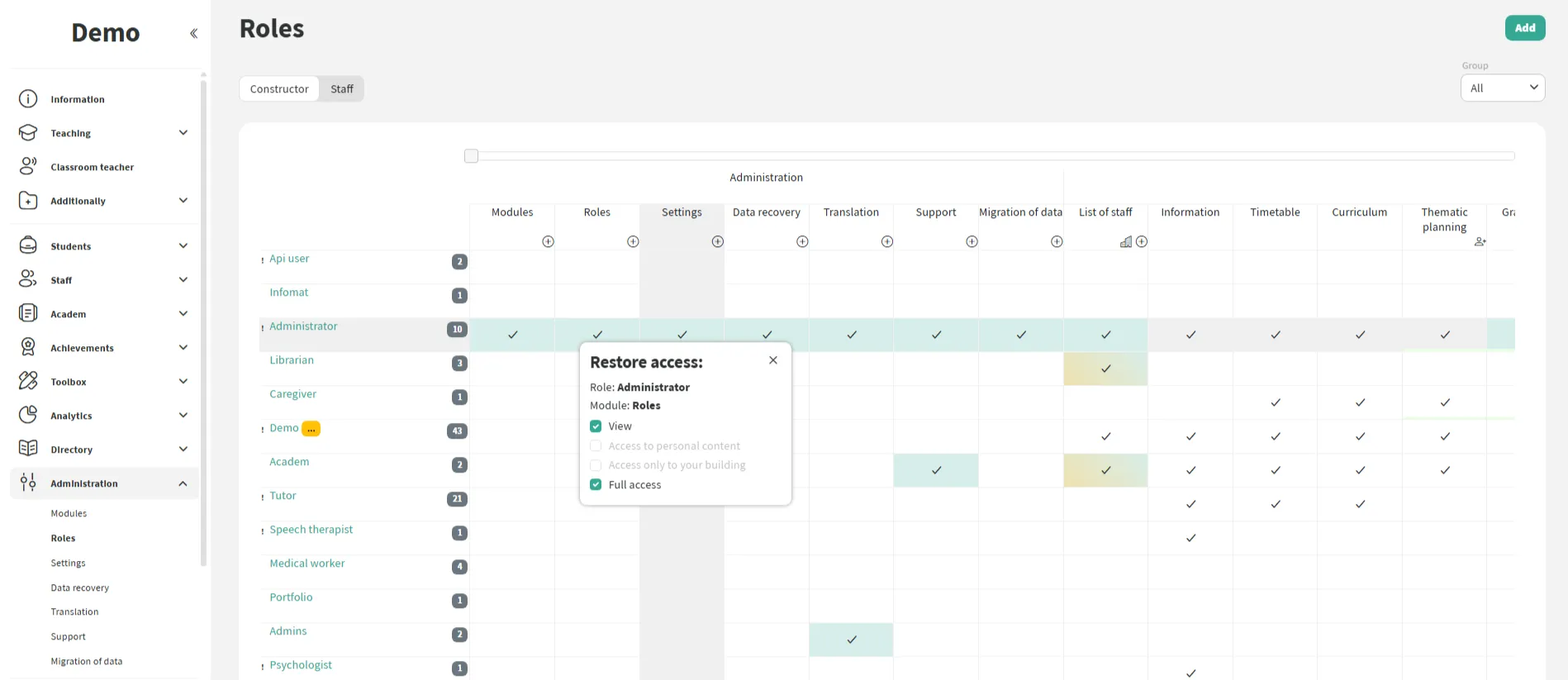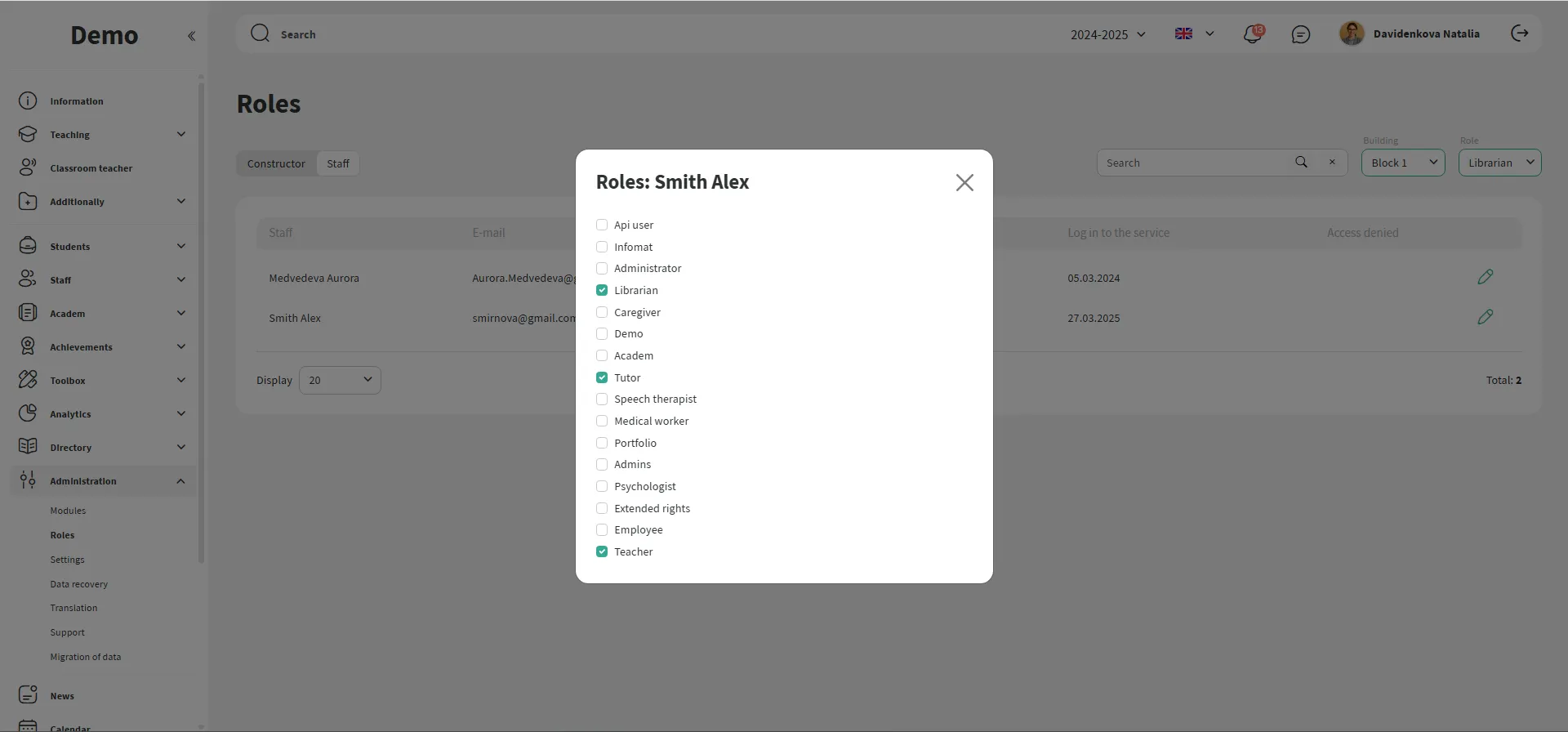 You can create any roles: deputy head, project coordinator, educational organizer, methodologist, etc. Each role is assigned permissions only for the modules it needs.