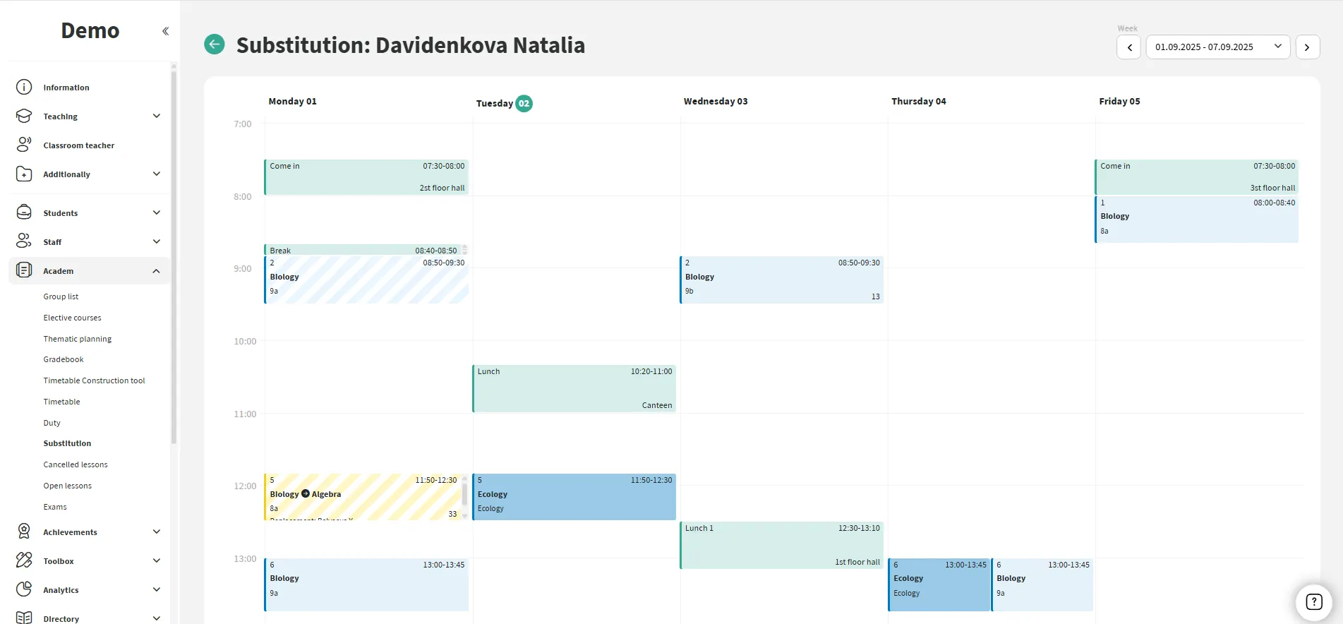 The system records every change. The administration can see how many lessons a teacher has conducted, how many substitutions were assigned, and analyze the workload.